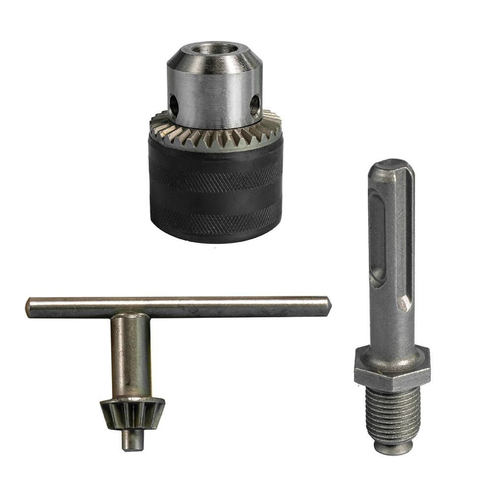 Mandrina este un subansamblu destinat fixarii accesoriilor pe axul unei masini de gaurit, utilizand geometrie pentru strangere cu cheie si un sistem cu trei bacuri pentru prinderea burghielor cu coada cilindrica. Intervalul de deschidere cuprins intre 1.5-13 mm acopera o gama larga de diametre, ceea ce asigura compatibilitate cu aplicatii obisnuite de gaurire. Filetul interior de 1/2" permite montarea mandrinei pe arborii standard ai masinilor de gaurit, oferind transmisie stabila a rotatiei si centru precis al accesoriului. Setul include un adaptor SDS, care extinde functionalitatea mandrinei prin permiterea utilizarii acesteia pe rotopercutoare echipate cu prindere SDS. Configuratia imbunatateste versatilitatea echipamentului si faciliteaza trecerea rapida intre modurile de lucru si utilizarea accesoriilor conventionale pe unelte cu sistem SDS.