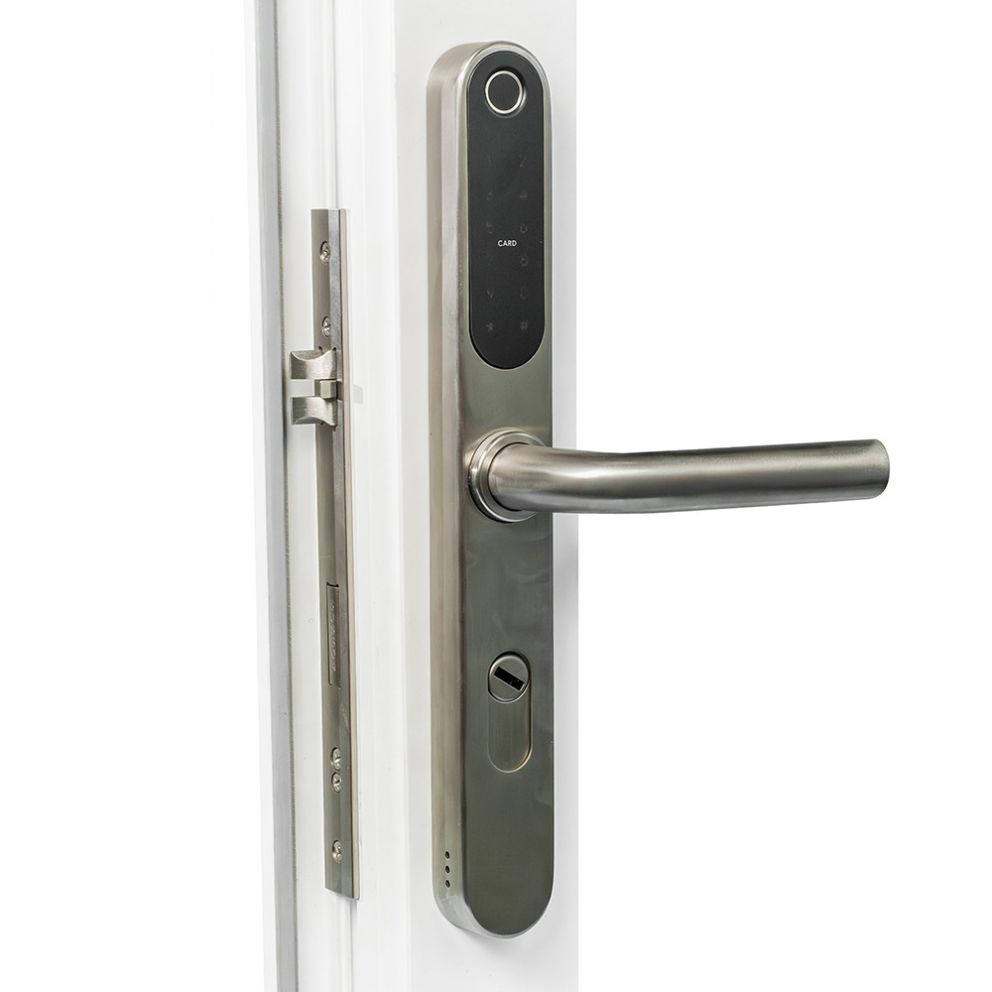 Manerul smart de usa este un sistem electronic modern de acces, proiectat pentru a imbina siguranta, confortul si designul contemporan. Acesta permite actionarea prin amprenta digitala, cod PIN, cartela sau aplicatia mobila TT LOCK, oferind multiple optiuni de identificare pentru utilizator.
